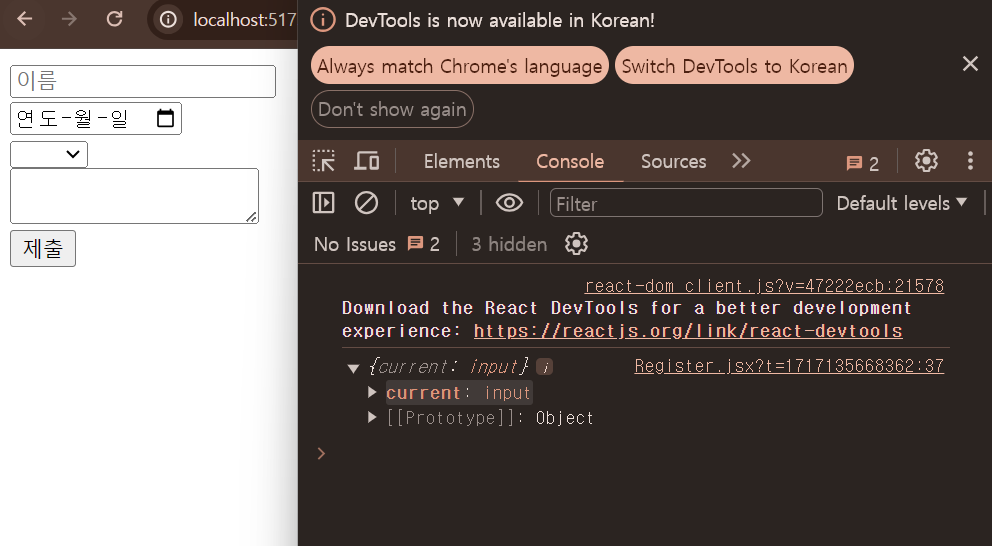 1. inputRef 라는 이름의 Reference 객체를 생성하고 name input 태그의 ref={ inputRef }를 설정하면